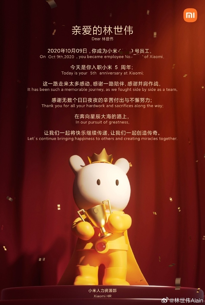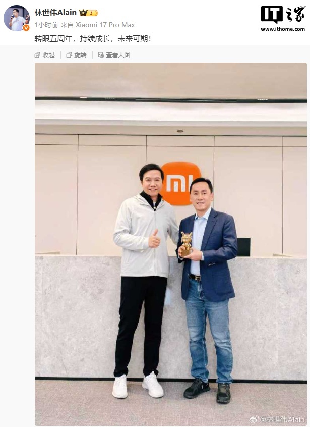 IT之家 10 月 9 日消息,小米集团副总裁、首席财务官林世伟今天发文纪念自己入职 5 周年,并晒出了雷军亲自为其颁发“金米兔”的合照。