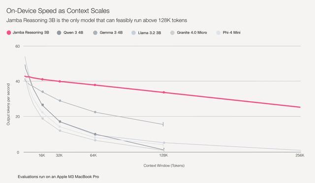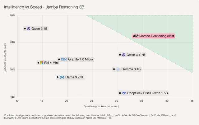 A21称,Jamba Reasoning 3B基于其新的SSM-Transformer架构构建,上下文窗口长度为256K个token,能够处理高达1M token,与DeepSeek、谷歌、Llama和微软等竞争对手相比效率提升了2-5倍,在基准测试中取得领先成绩。