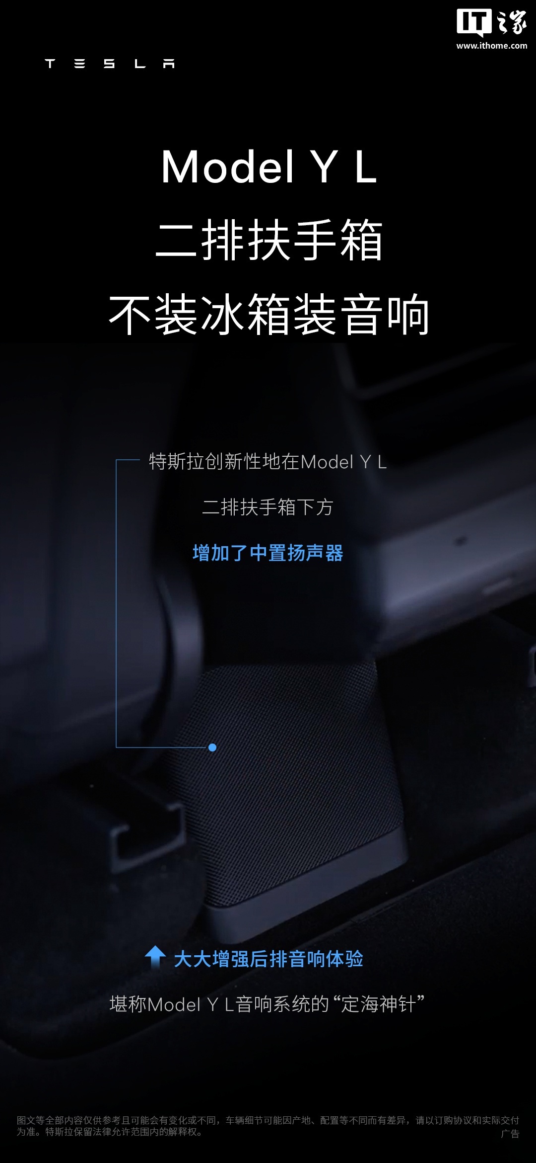 特斯拉官方今日发文介绍了 Model Y L 汽车的音响系统。据称,该车首发特斯拉智能音响算法系统,号称给车装上“音乐大脑”,同时二排扶手箱不装冰箱装音响,创新性地在 Model Y L 二排扶手箱下方增加了中置扬声器。