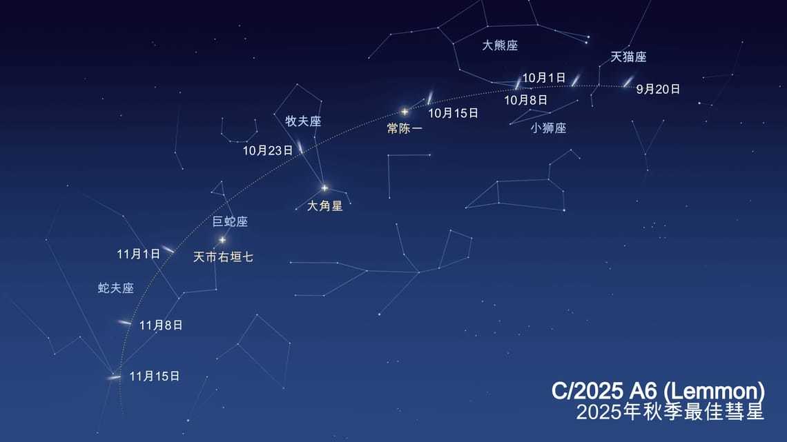 除此之外,我们还能在 10~11 月看到 C/2025 A6(莱蒙)彗星,最佳时间是 10 月 12 日至 11 月 2 日,在远离城市灯光的黑暗天空下可被肉眼看到;预计它将在 10 月 31 日或 11 月 1 日左右达到最亮。