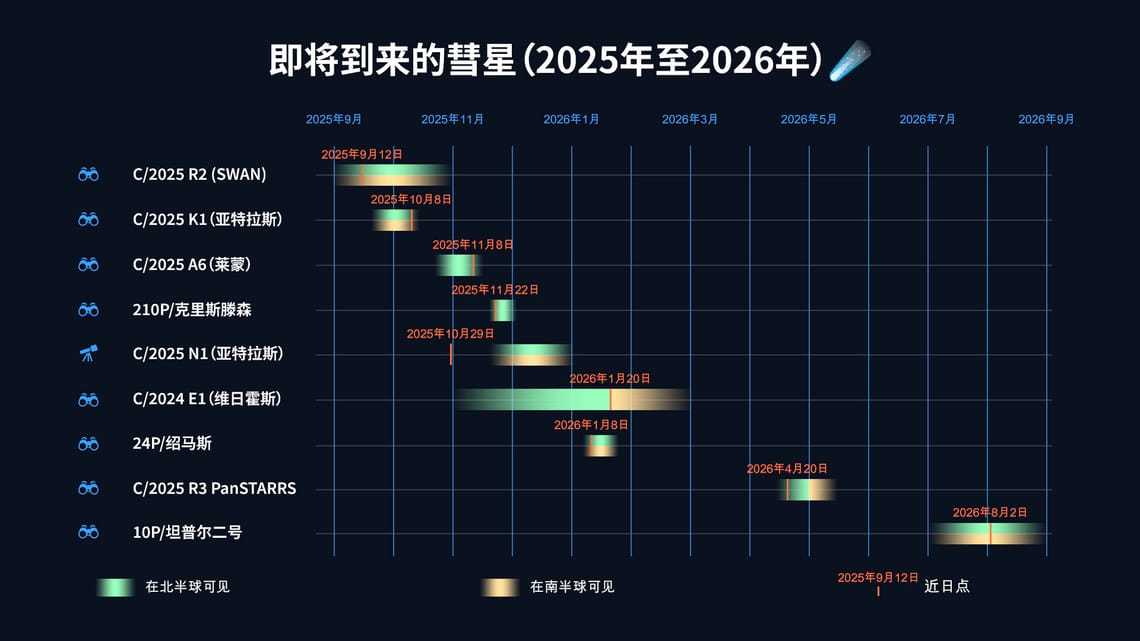 后续,3I/ATLAS 或 C/2025 N1(ATLAS)彗星预计 2025 年 10 月 29 日抵达近日点(12 等),12 月 19 日抵达近地点(视星等未知),预计将于 11 月下旬起可见,南北半球均可见。