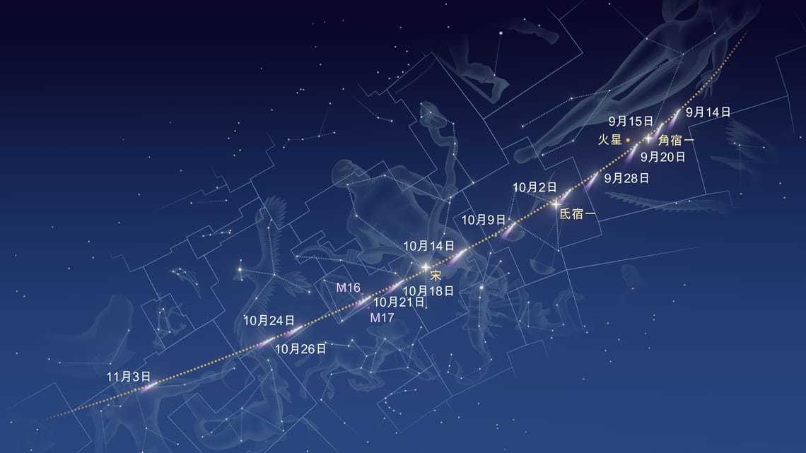 10 月初,这颗彗星已在北半球出现,低悬在天秤座西南方的傍晚地平线上。随着秋季推进,北半球的可见性将稳步改善,到 10 月下旬日距将达到约 60°。