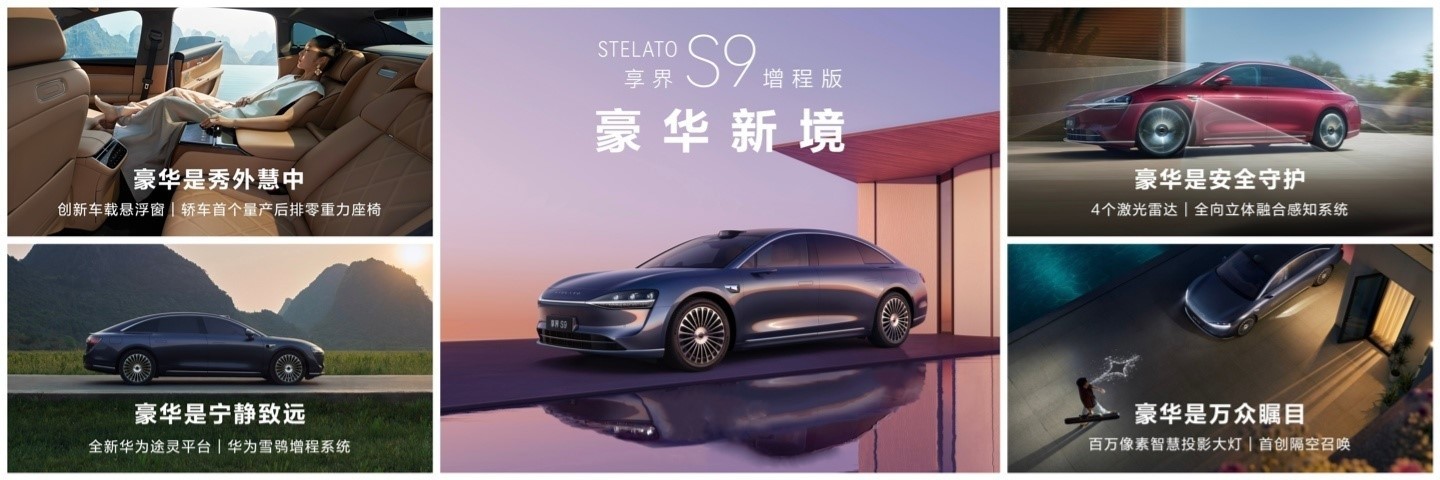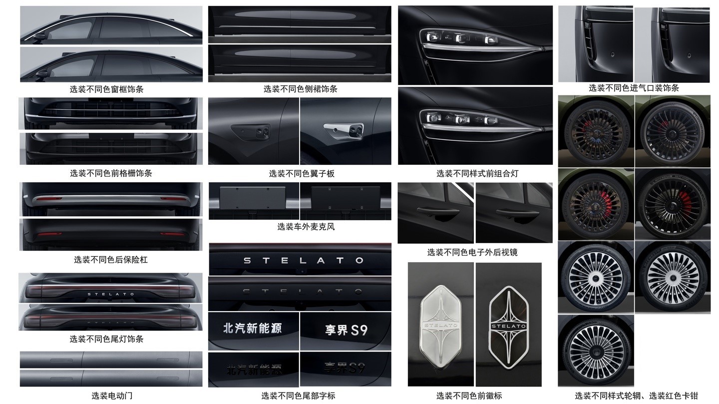 新款鸿蒙智行享界 S9 汽车可选装不同色窗框饰条、不同色前格栅饰条、不同色侧裙饰条、不同色后保险杠、不同色翼子板、不同色尾灯饰条、不同色尾部字标、不同样式前组合灯、不同色电子外后视镜、不同色前微标、不同色进气口装饰条、不同样式轮辋、红色卡钳、电动门、车外麦克风等。