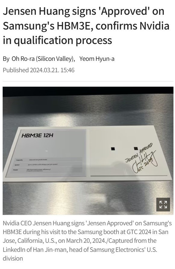 本次消息与三星首次被传出入选英伟达供应链距离 1 年 7 个月,去年 3 月举行的 NVIDIA GTC 2024 大会上,黄仁勋曾亲自给予三星“老黄认证”,在展示的 HBM3E 样品中签下“Jensen Approved”(IT之家注:黄仁勋认可),但随后三星在英伟达的质量测试中屡屡受挫。