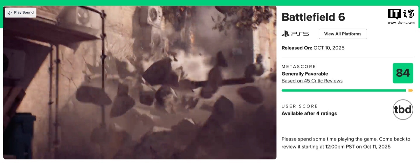 IT之家 10 月 10 日消息,EA《战地风云 6》将于北京时间 10 月 10 日(今天)晚 11 点上线,登陆 PS5 / Xbox Series X|S / PC 平台,目前本作全球媒体评测已解禁,截至IT之家发稿,游戏在 Metacritic 上 PS5 版 84 分(51 家媒体)、Xbox Series X|S 版 88 分(10 家媒体)、PC 版 84 分(36 家媒体)。