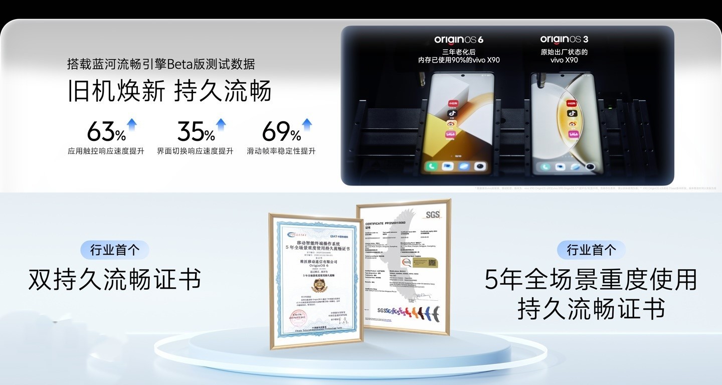 IT之家注意到,vivo 官方以使用三年后搭载蓝河流畅引擎 Beta 版的 X90 为例,跟出厂时搭载 OriginOS 3 的 X90 新机进行对比测试。应用触控响应速度提升 63%,界面切换响应速度提升 35%,滑动帧率稳定性提升 69%。