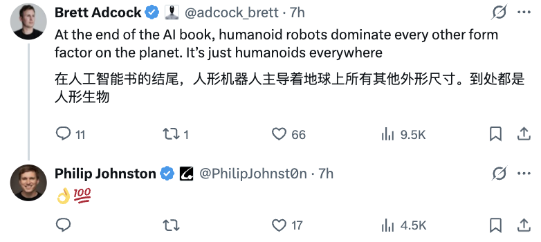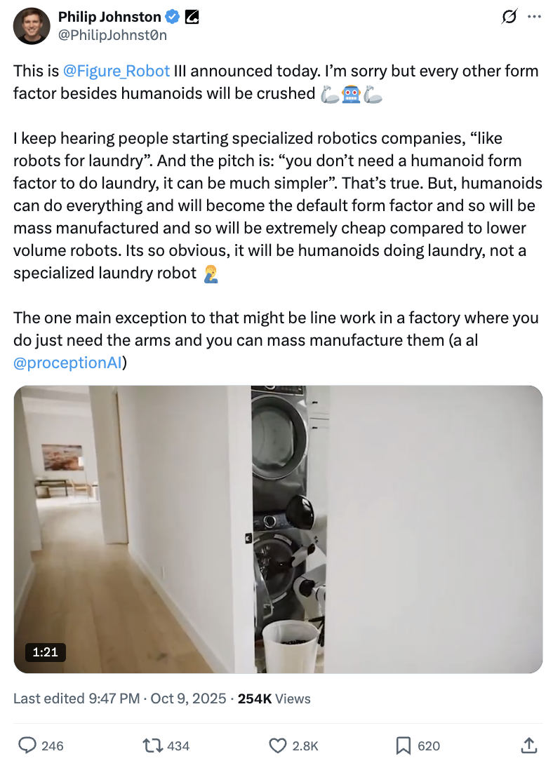 美国初创公司Starcloud联合创始人兼CEO Philip Johnston转发了Figure 03的表现并直言,“除人形机器人外,其他任何形态的机器人都将被击败”: