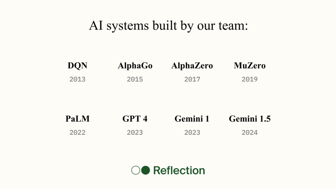 Reflection AI的团队成员曾参与推动多个重大AI项目:PaLM、Gemini、AlphaGo、AlphaCode、AlphaProof,以及ChatGPT、Character AI等。