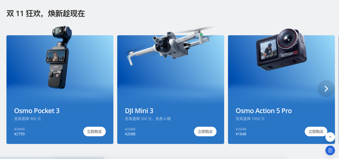 10月9日,大疆官网正式上线“双十一”促销信息,多款产品价格直降数百元至上千元。