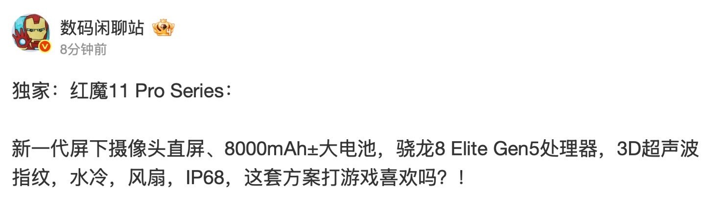 据IT之家此前报道,博主 @数码闲聊站 曾在上个月,透露红魔 11 Pro 系列手机将延续新一代屏下摄像头直屏,搭载第五代高通骁龙 8 至尊版处理器,匹配 8000 毫安时电池,提供 3D 超声波指纹、支持水冷 / 风扇散热,拥有 IP68 认证,强调游戏体验。