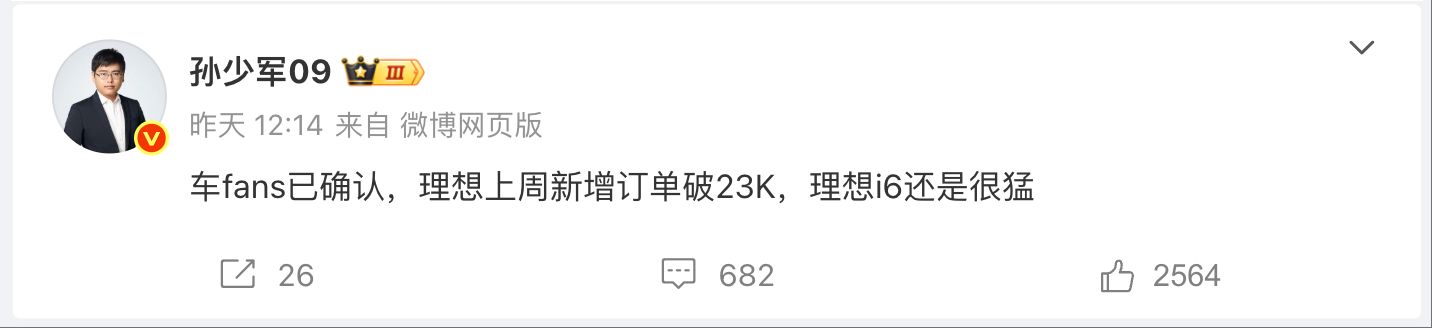 另据汽车博主“孙少军”消息,理想上周新增订单破23K。