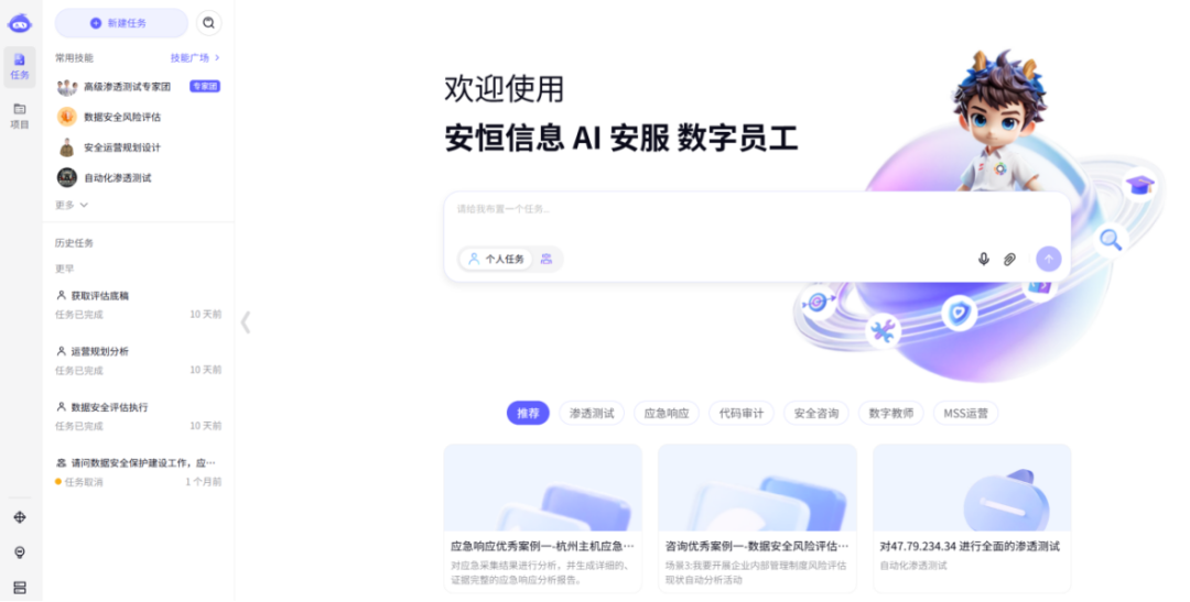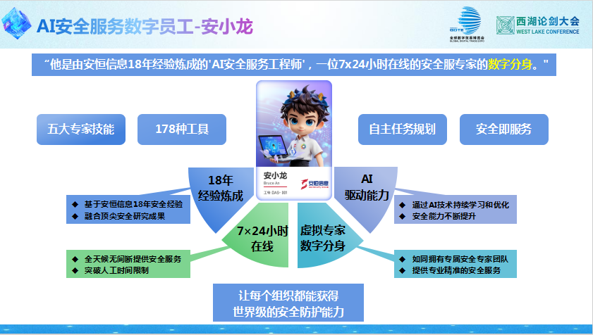在这两次检测中发挥关键作用的安小龙,名字源自安恒信息吉祥物,这是一条象征守护的小龙。在AI快速重塑各行各业的时代,这家来自杭州的企业,抢先推出全球首个AI安服数字员工,将曾经昂贵、稀缺的专业安全能力,变得触手可及。