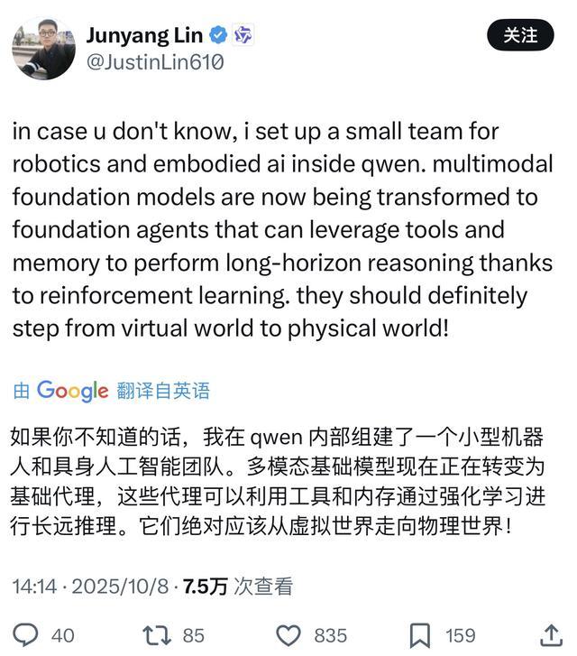 智东西10月9日报道,昨日,阿里通义千问大语言模型负责人林俊旸在社交平台发文称,阿里通义内部已设立“机器人与具身智能团队”。