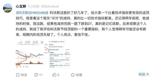 雪球平台上有观点认为,冷泠的减持可能意味着当前阶段科沃斯达到了阶段高点。其中一位网友提到,冷泠减持是对科沃斯最准确的判断之一,并且23年6月冷泠减持37.5万股,减持价格为73.88元。