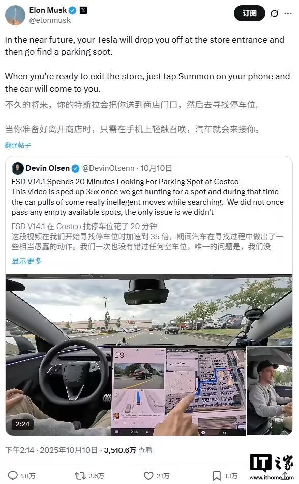 马斯克回应特斯拉 FSD V14 自动找车位:未来车辆将实现“自动泊车与召唤”一条龙式体验