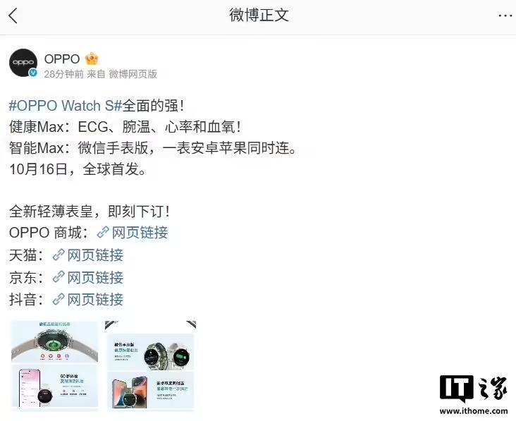 IT之家 10 月 11 日消息,OPPO Watch S 将于 10 月 16 日 19:00 全球发布,号称“轻薄表皇”,官方今日介绍了新品的部分功能。