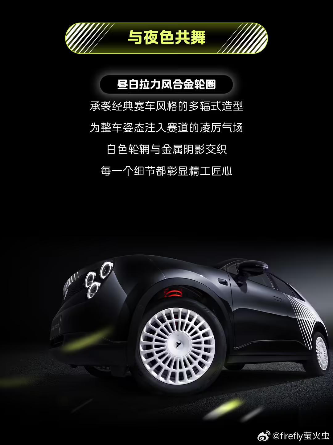 其他方面,firefly 萤火虫采用了前麦弗逊、后五连杆悬架,接近 50:50 前后车重比例,拥有 4.7 米同级最小转弯半径。