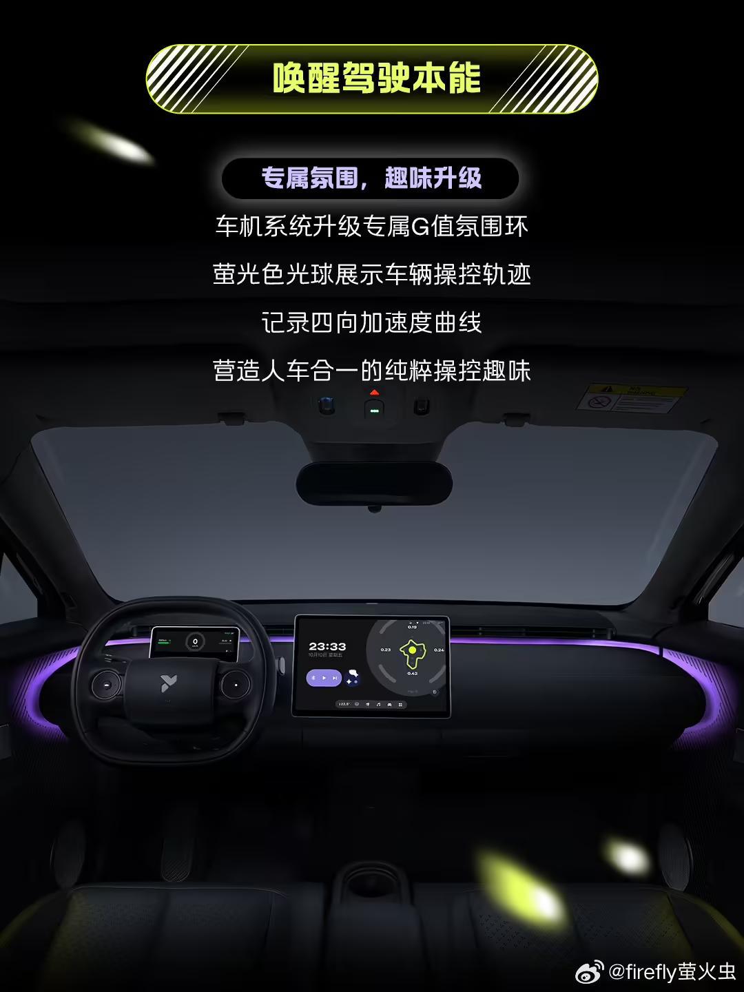 内饰方面,firefly 萤火虫采用了简约设计风格,内饰颜色与车身颜色相呼应,提供惬意紫、松弛绿、沉静黑、温暖米 4 种色调可选。此外,新车屏幕在增加 G 值氛围环,并提供定制黑色钥匙卡。