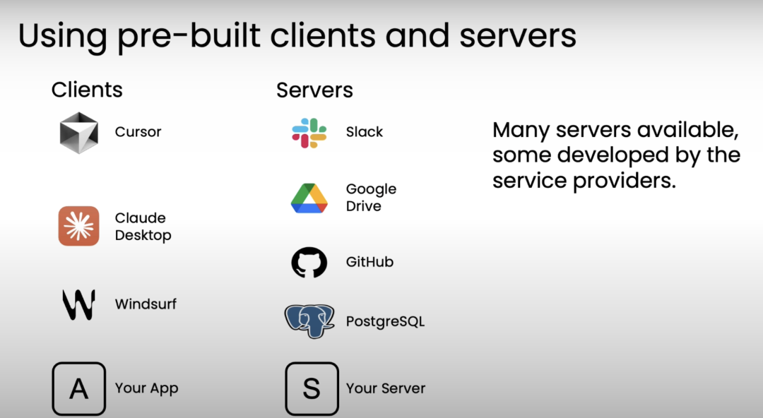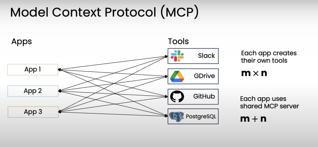 与此同时,不同的开发者可能都想让AI或程序去操作Slack、GitHub、数据库、云服务等来获取数据或工具。