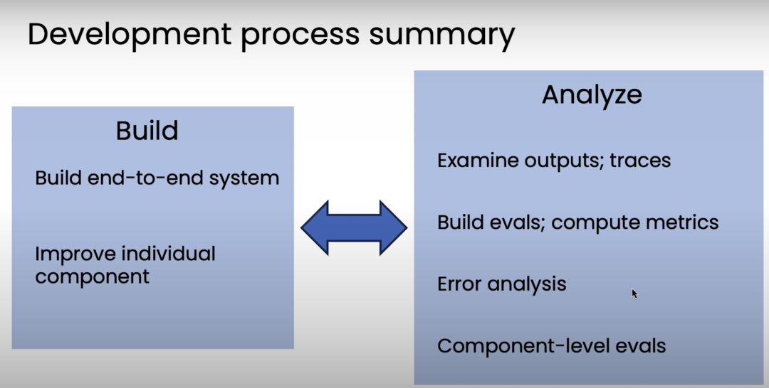 具体来说,错误评估既有端到端的输入输出评估,也有组件级别的评估,而组件级别的评估可以更快的找到具体出现错误的地方,从而集中精力更好、更快的改进系统。