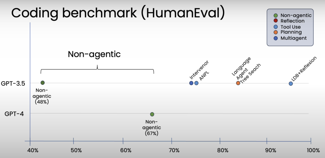在课程演示中,通过使用Agentic技巧,甚至可以让GPT-3.5在编程任务中轻松秒杀GPT-4。