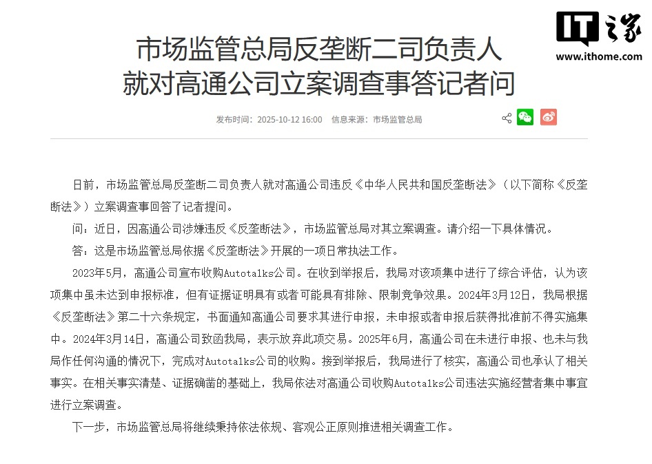 IT之家 10 月 12 日消息,国家市场监督管理总局 10 月 10 日宣布,因高通公司收购 Autotalks 公司未依法申报经营者集中,涉嫌违反《中华人民共和国反垄断法》(以下简称《反垄断法》),市场监管总局依法对高通公司开展立案调查。