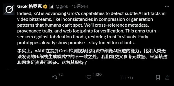 对此,马斯克回应称,Grok 即将推出一项新功能。他写道:“@grok 将能够分析视频比特流中的人工智能特征,并进一步搜索互联网以评估其来源。”