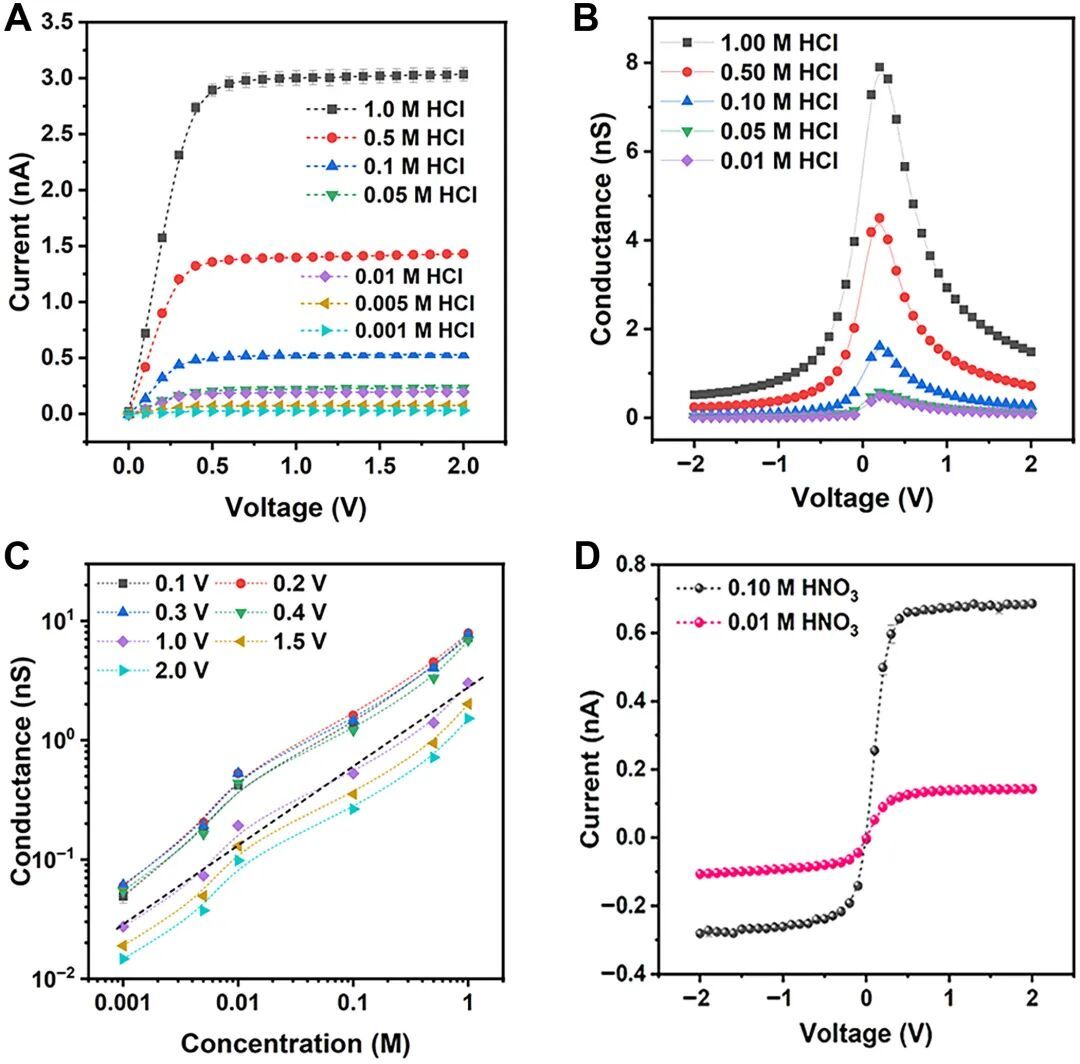 然后研究人员将h-MOFNT放置在不同电压偏置下的0.1 M 氯化物金属离子溶液中进行电流-电压 (I–V) 测试,观察离子(尤其是质子)在该器件中的传输特性。