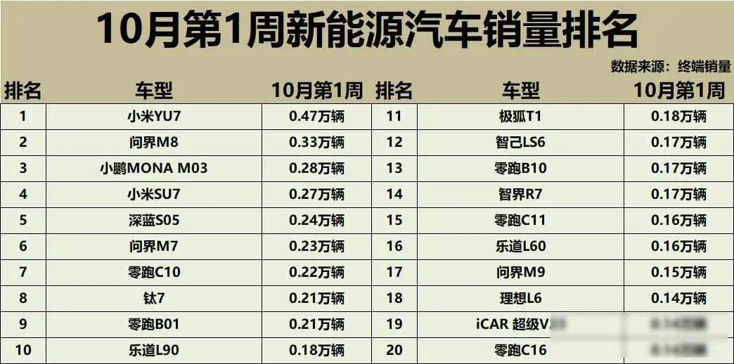 国庆第一周,新势力销量榜出来了,小米YU7卖了四千七百台,排第一,问界M8跟在后头,三千三百台,小鹏MONA M03和小米SU7也挤进前四,零跑更厉害,C10、C16、B01、T03四款车全进了前十,这可不是碰巧,是方法真变了。