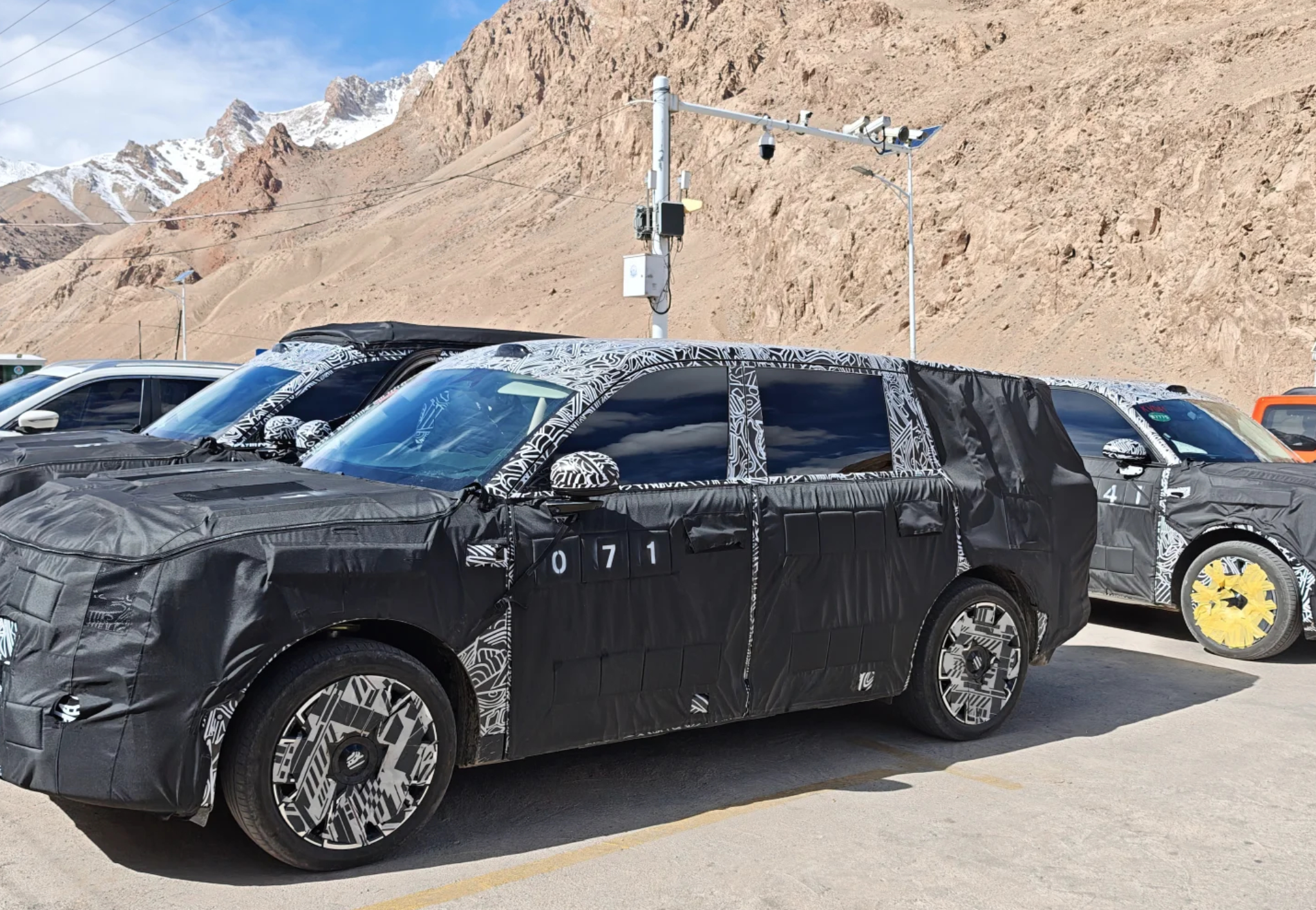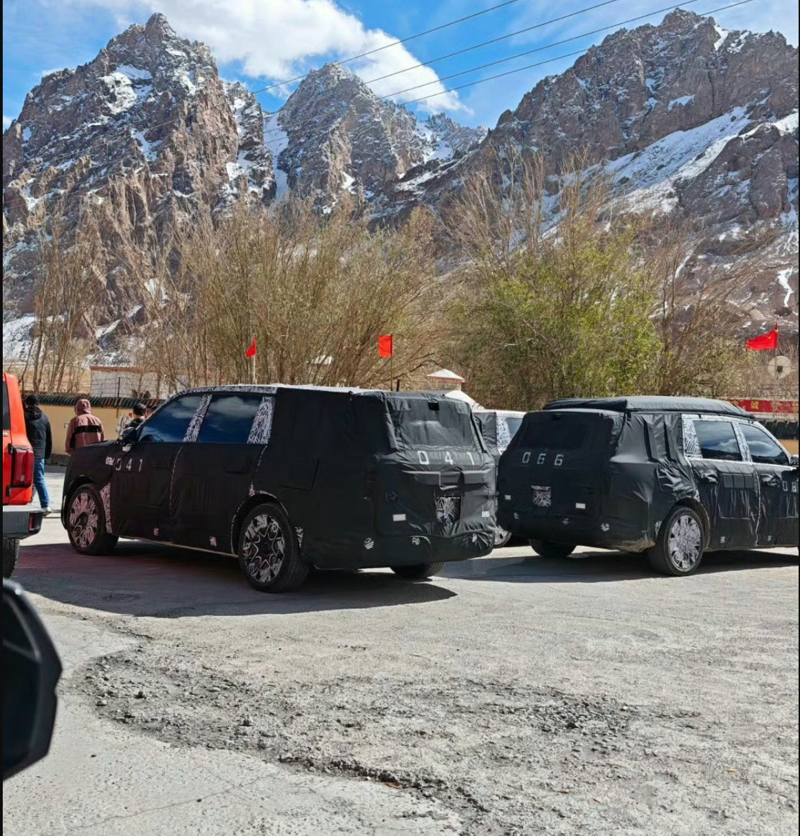 网友拍摄到的车队画面显示,除了 YU7 外,还有几辆披着厚重伪装的小米全尺寸 SUV 测试车,最后一辆编号是「041」。