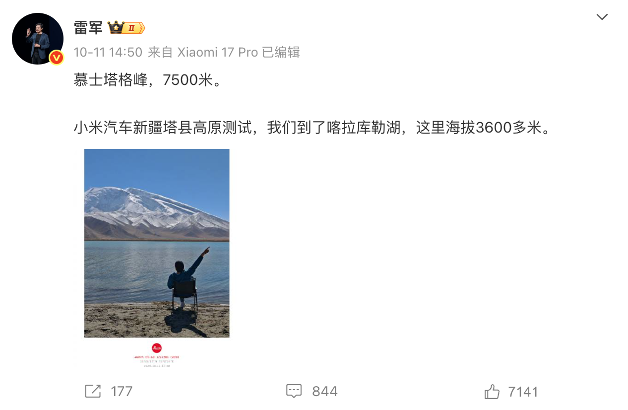 雷军在 10 月 11 日下午在微博上分享了一条动态,「小米汽车在新疆塔县做高原测试,我们到了喀拉库勒湖,这里海拔3600多米」,之后又补充到「实际测试地在帕米尔高原,平均海拔超过4000米,有20多位工程师在这儿,他们主要测小米YU7的高原续航、充电情况还有防晒性能。」