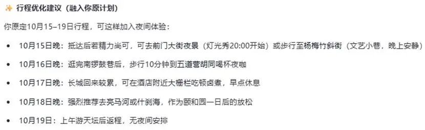 这次Qwen则推荐了什刹海、亮马河国际风情水岸等去处,以及去天桥和国家大剧院看演出、去簋街吃夜宵和夜骑胡同等娱乐方式。
