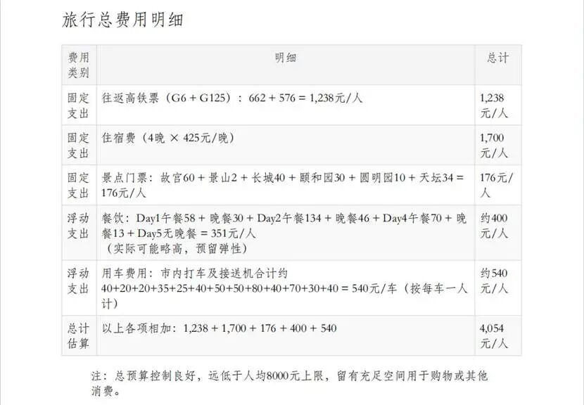 餐饮方面也无可挑剔,能够满足旅客的需求,每日的餐饮预算以表格形式展现,赏心悦目。