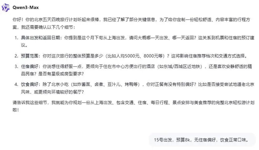 但由于预设的提示词比较随意,Qwen注意到了这一点,并提出了更加细致的询问: