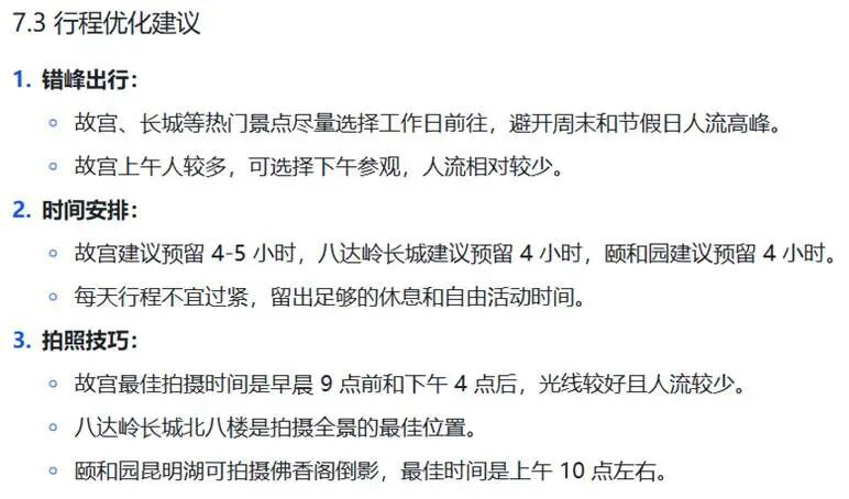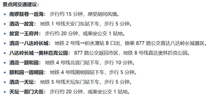 同样是交通方面,豆包也展现出了一个亮点,它清晰的列出了用户抵达北京后从酒店到景点以及景点之间的交通方式: