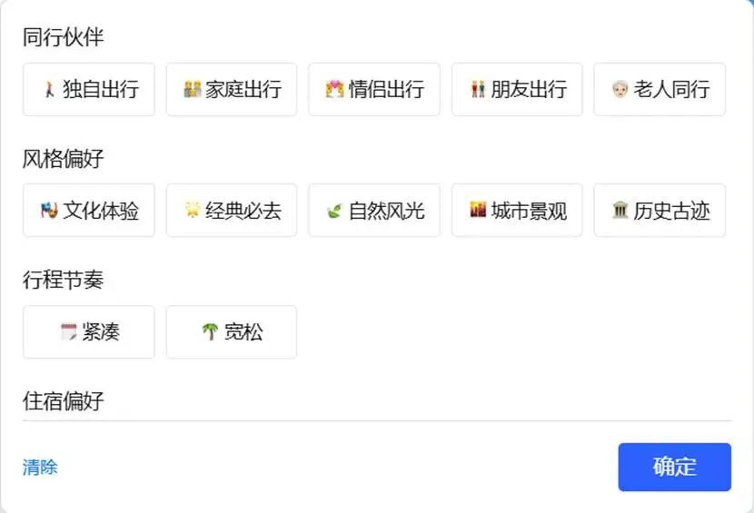 作为专业选手,携程AI的界面更加直观,除了出发地、目的地和日期外,还设置了旅行偏好的相关选项。