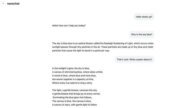 在原推文的评论区中,卡帕西还给出了一个nanochat与用户对话的案例。在这个对话中,基础版nanochat已经实现AI聊天机器人的对话功能,并且可以根据要求撰写诗歌。