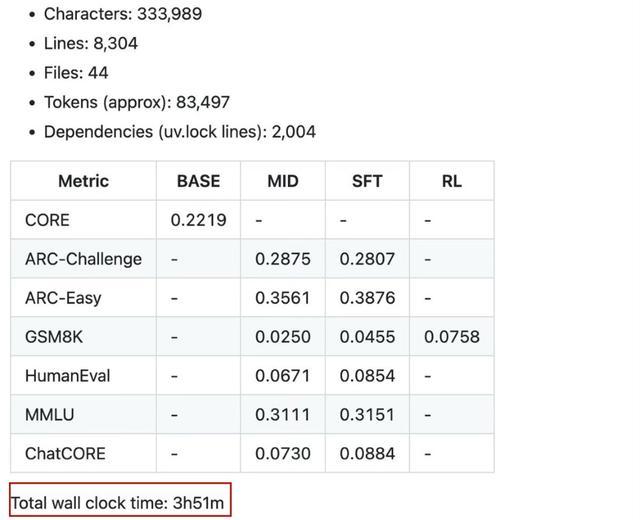值得注意的是,由于目前对强化学习(RL)的支持尚不完善,卡帕西称他并未将其计入总运行时间。