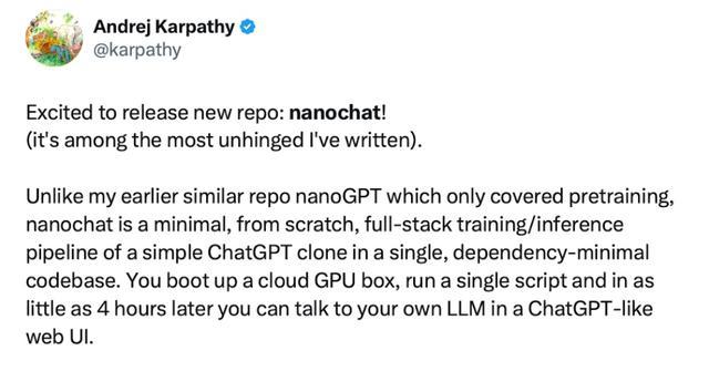 智东西10月14日消息,昨夜,前特斯拉人工智能与自动驾驶视觉总监、OpenAI研究员安德烈·卡帕西(Andrej Karpathy)开源nanochat,号称可以只用不到100美元(约合人民币711.5元)训练出“简易版ChatGPT”,一经发布在GitHub上就获得了5.6k星。