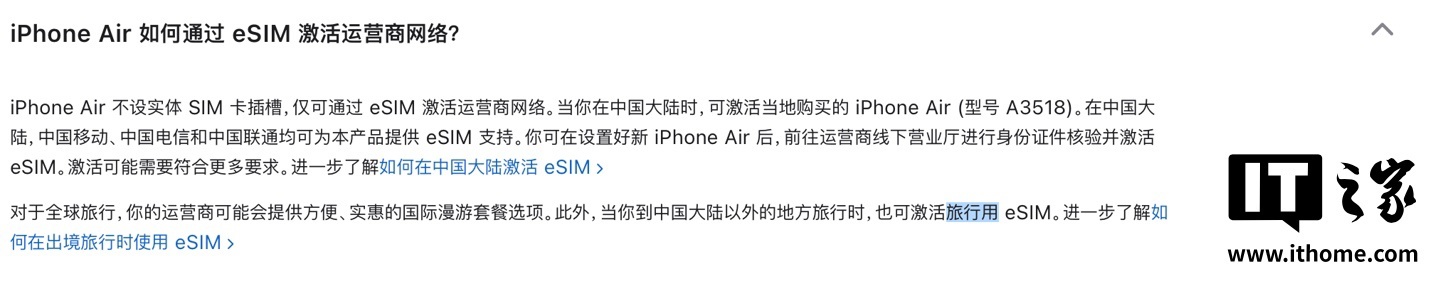 IT之家 10 月 14 日消息,苹果中国官网今天已更新 iPhone Air 的发售信息。在“常见问题解答”栏目中,苹果回应了有关 eSIM 的许多问题。