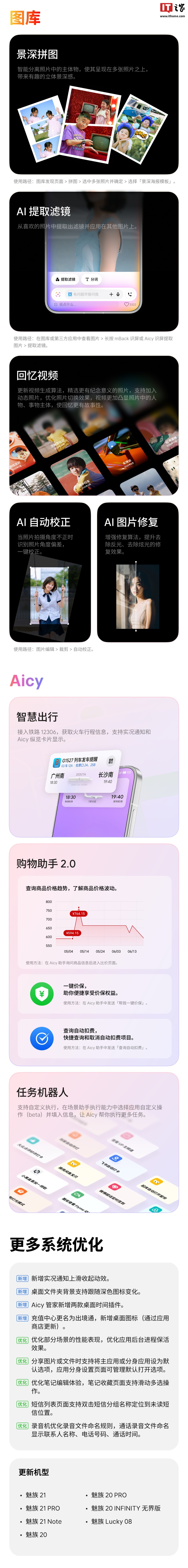 IT之家 10 月 14 日消息,据魅族 Flyme AIOS 官方今日消息,魅族 20 系列、21 系列、魅族 Lucky 08 的系统新版本发布,版本号为 12.3.0.0A,带来了图库景深拼图、AI 滤镜提取、Aicy 铁路 12306 实况通知等功能。