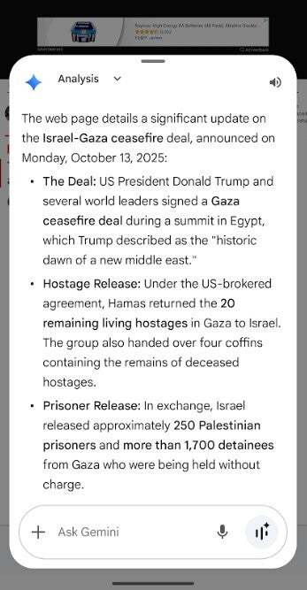在安卓设备上,运行安卓 16 稳定版或者最新 Android 16 QPR2 Beta 2 更新的设备,已系统集成该功能。在 Chrome 浏览器中打开任意网页后,用户只需长按电源键,系统便会调出 Gemini 浮层界面。
