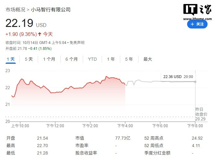 值得一提的是,小马智行美股昨日收涨 9.36%,目前市值达 77.73 亿美元(现汇率约合 554.6 亿元人民币)。