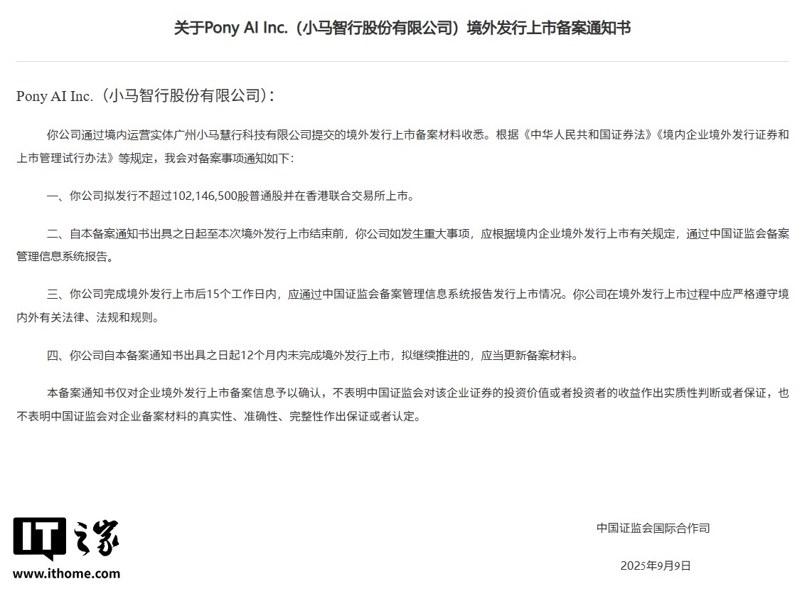 IT之家 10 月 14 日消息,中国证监会今日发布了《关于 Pony AI Inc.(小马智行股份有限公司)境外发行上市备案通知书》。公告显示,小马智行拟发行不超过 102,146,500 股普通股并在香港联合交易所上市。