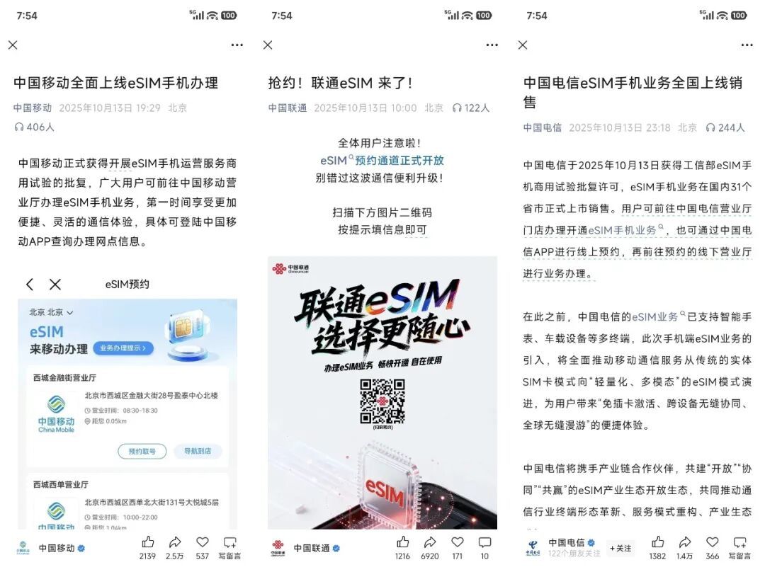 近日,中国移动、中国联通和中国电信三大运营商先后官宣启动 eSIM 相关业务的办理。