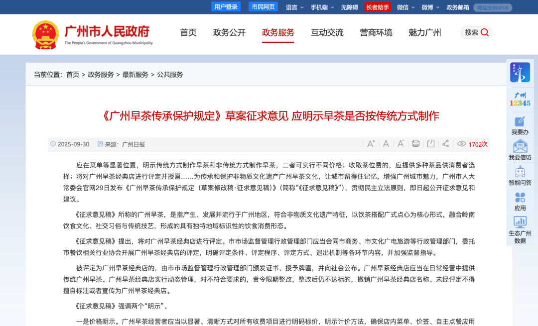 据《中国新闻周刊》报道,广州市人大常委会近日公布《广州早茶传承保护规定(草案修改稿 · 征求意见稿)》,向社会公开征求意见,截止日期为 10 月 28 日。
