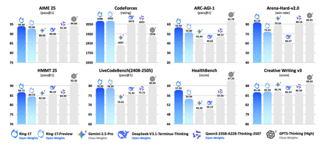 作为继 9 月底 Ring-1T-preview 之后的正式版本,Ring-1T 在大规模可验证奖励强化学习(RLVR)与 RLHF 训练下,进一步提升了自然语言推理与通用能力,在多项任务榜单上表现均衡。