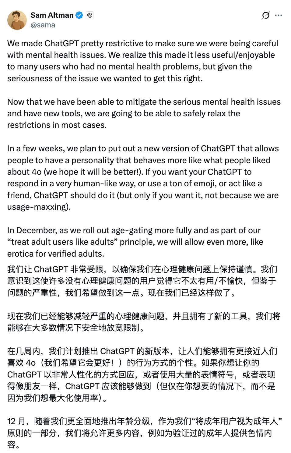 Altman 表示,此前 OpenAI 对 ChatGPT 有不少内容限制,并且对心理健康问题一直保持谨慎态度。Altman 称团队意识到这使许多没有心理健康问题的用户觉得 ChatGPT 用起来「不爽」或「不愉快」,「但鉴于问题的严重性,我们希望做到这一点。(指内容限制)」