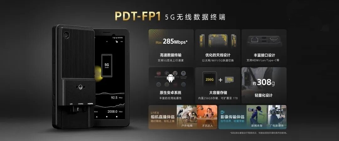 PDT-FP1 无需采集卡,可以通过 HDMI 接口,直接连接相机获取优质影像,随时随地快速开播;支持在以太网、无线 Wi-Fi、双 SIM 卡 5G 网络间快速切换。