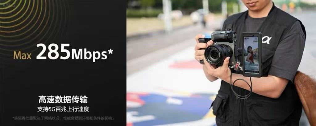 索尼 PDT-FP1 支持以太网、Wi-Fi、5G 网络快速切换,5G 上行速度最高可达约 285 Mbps;搭载了约 5000mAh 电池和独立充电口,直播用户可以边充电边直播。